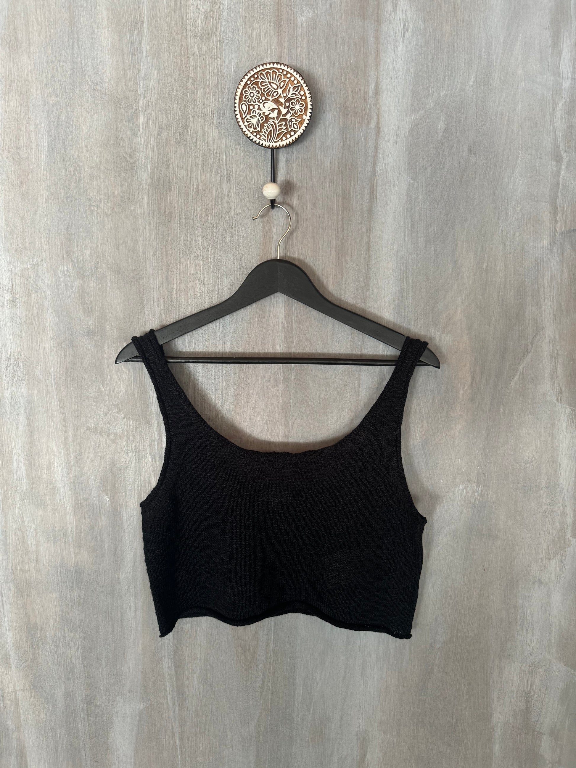Adorable simple cropped solid-knit tank top in black. This is a sleeveless tank with a deep scoop neckline and back. Pair with the linen cream pants for a perfect summer fit.