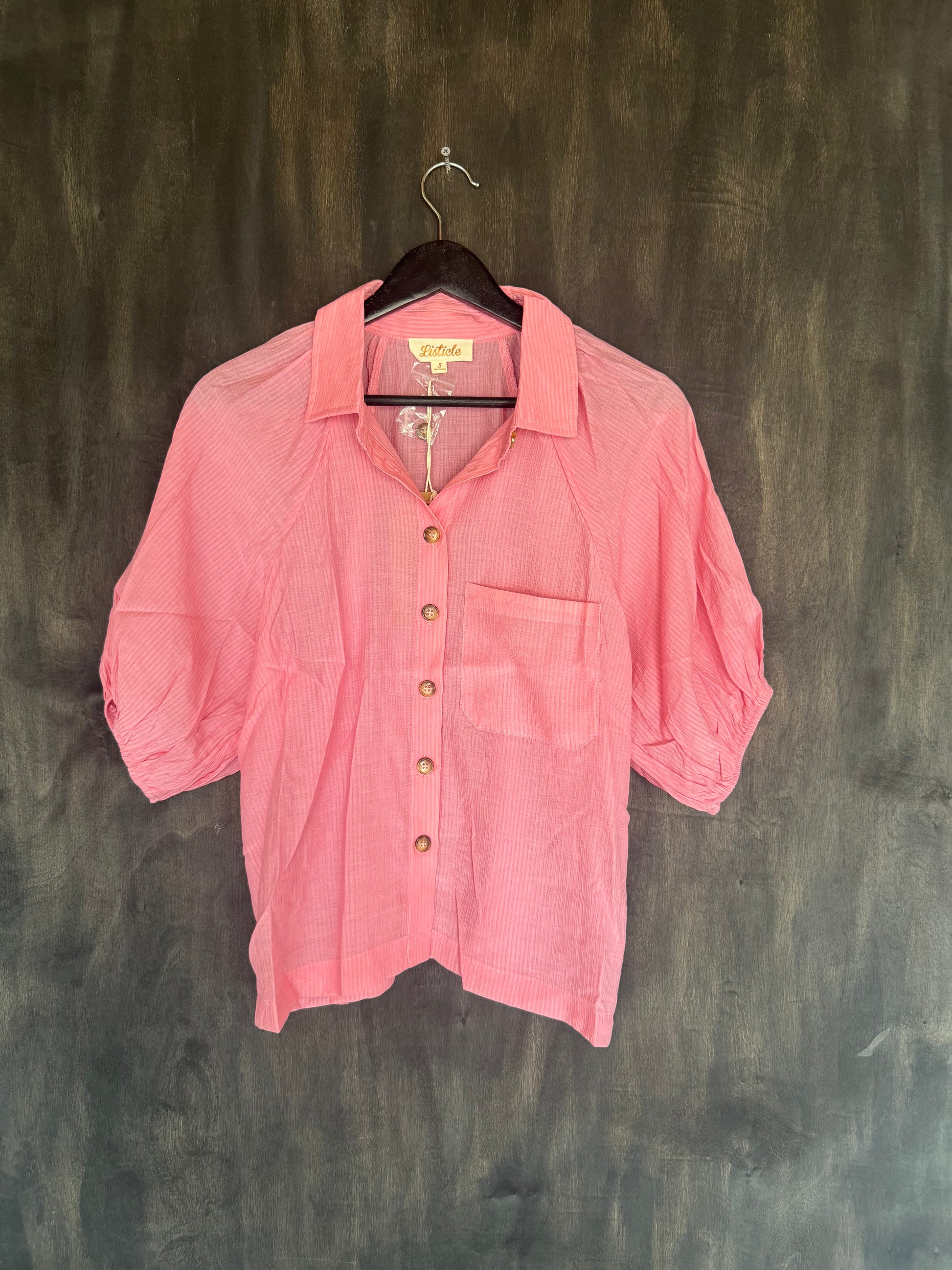 Dolman sleeves button down textured top - Round neck with collar - Button down - Puff sleeves with elastic cuffs - Patch pocket on chest - Finished with clean hem