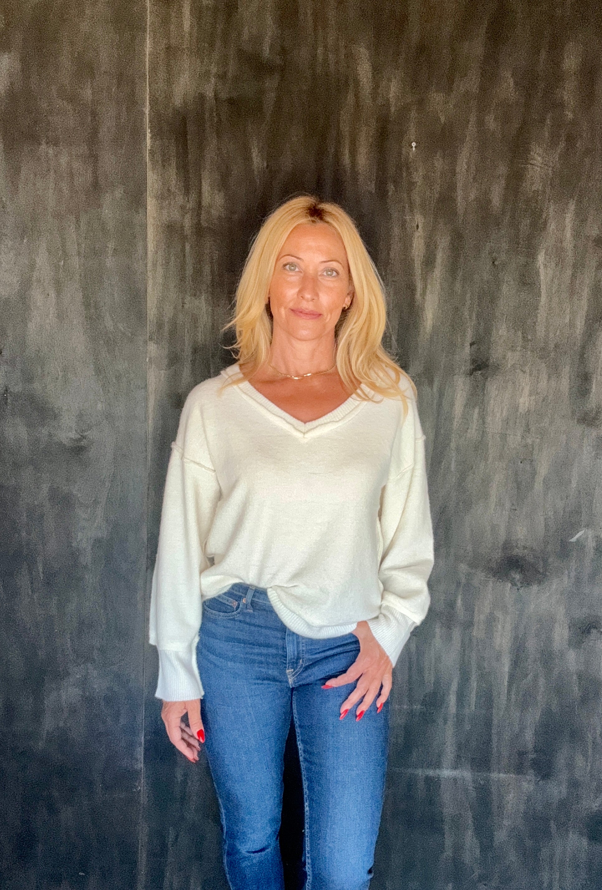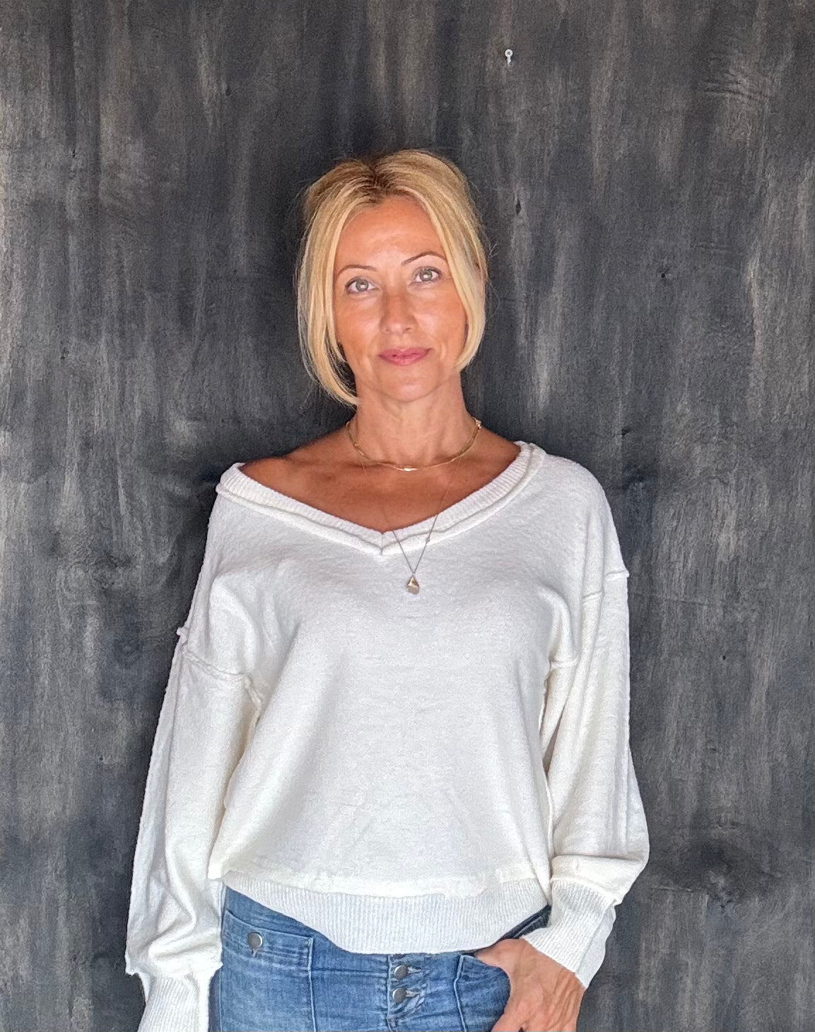 This v-neck sweater is so soft!!!! Drop shoulders allow for the off the shoulder look. Size up for a slouchier fit. The exposed seam detail along with ribbed knit trim take this from basic to better.