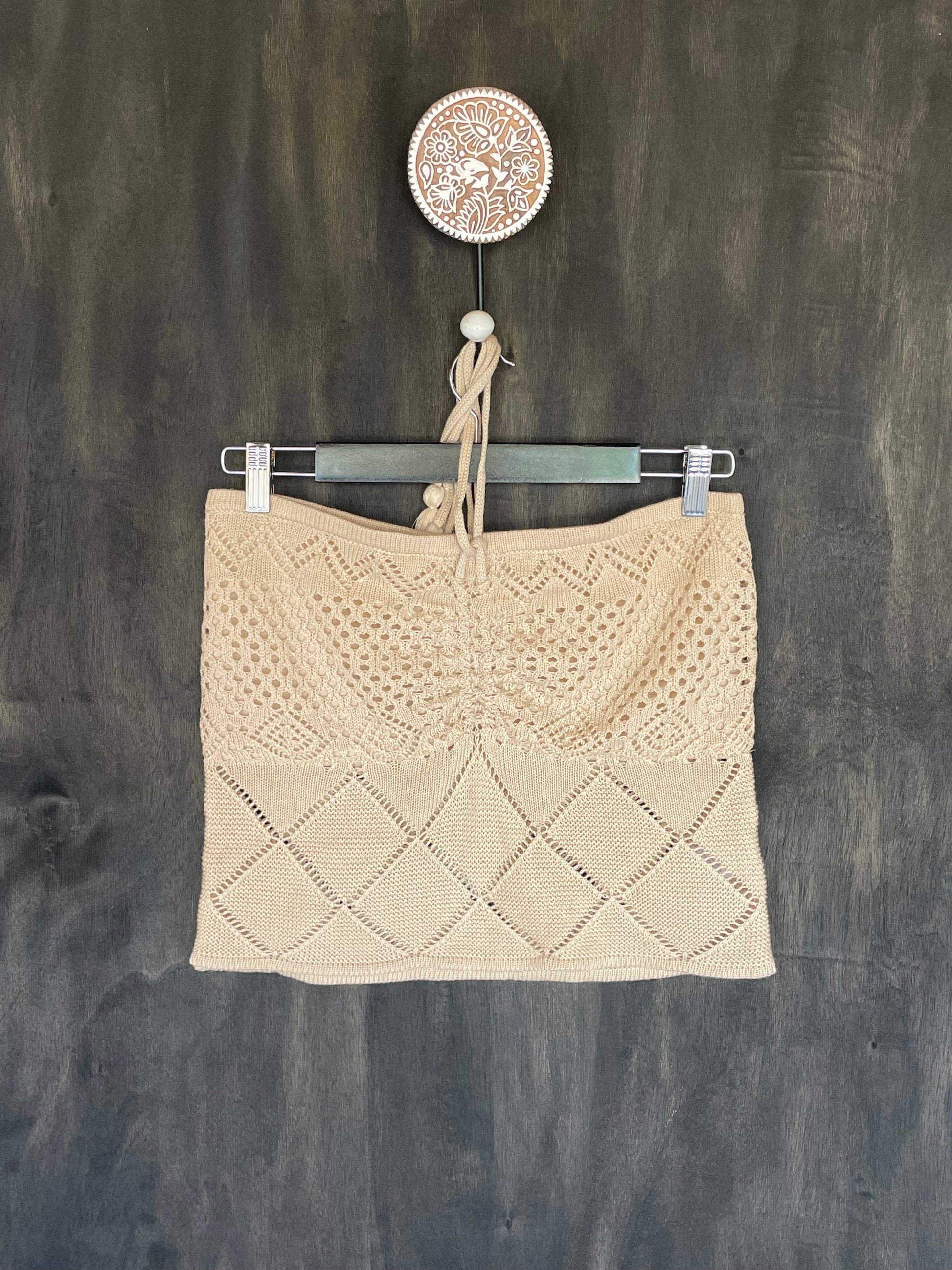 A solid, crochet knit sweater halter top with the following features: Tasseled self-tie halter neckline. Ruched bust. Partial lining. Eyelet knit. Cropped length. Low back. Relaxed fit.