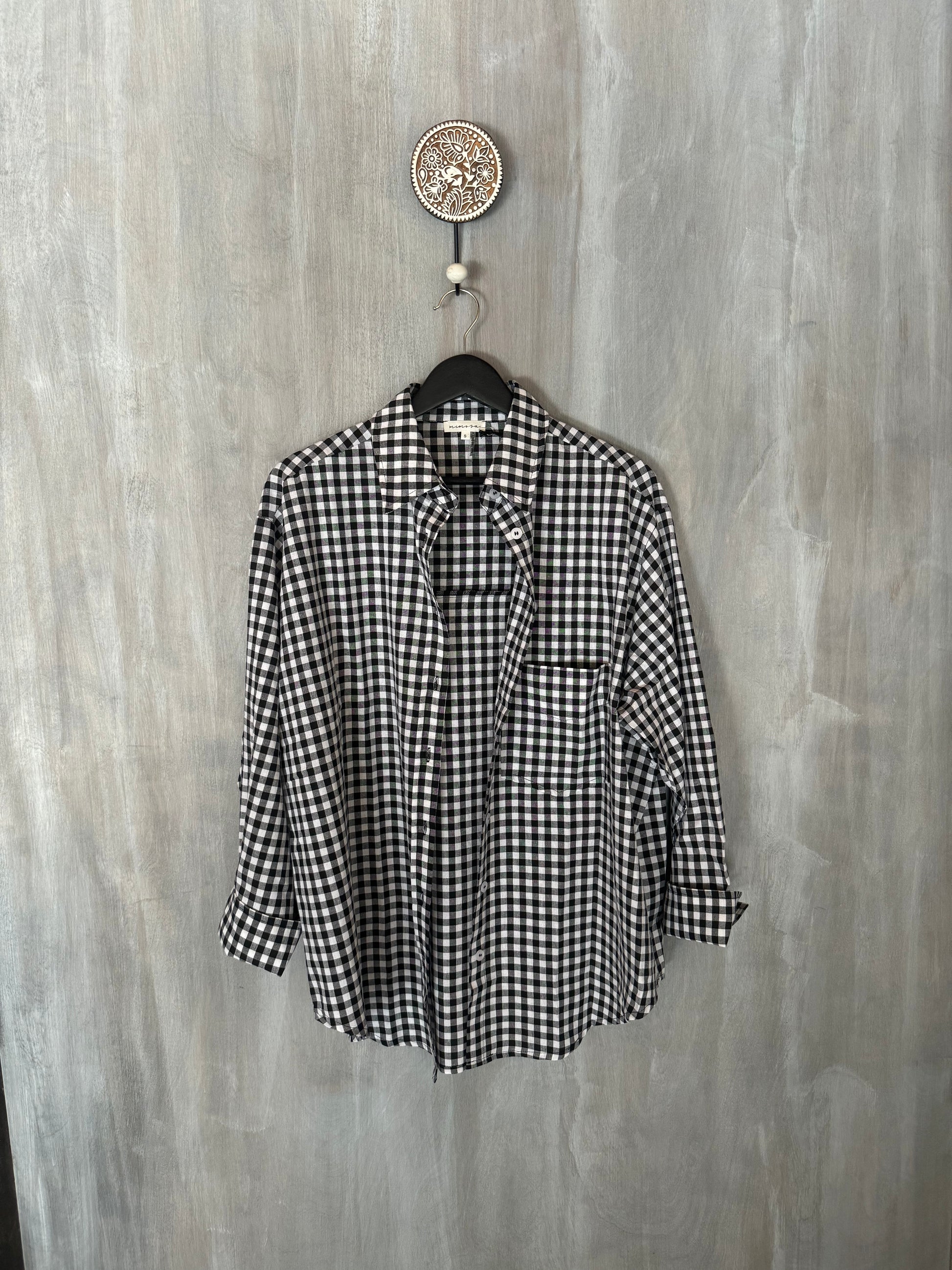 Collared oversized button-down shirt featuring a gingham print with a single front pocket. Wear it unbuttoned or all the way up and pair with jean shorts or skirt for an effortless look !!!